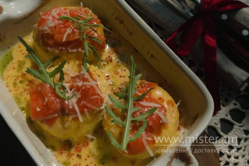 Ніжні сирники на основі фермерського сиру, злегка підсолені та обсмажені до хрумкої скоринки. Подаються з пряним лососем та вершковим соусом голандез на основі жовтків та вершкового масла.