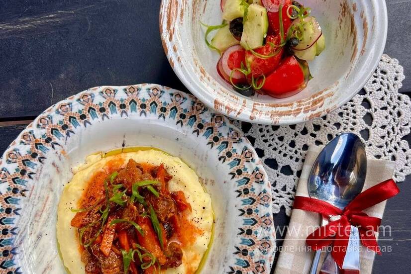 Картопляне пюре з тушкованою яловичиною та овочами і салат овочевий.