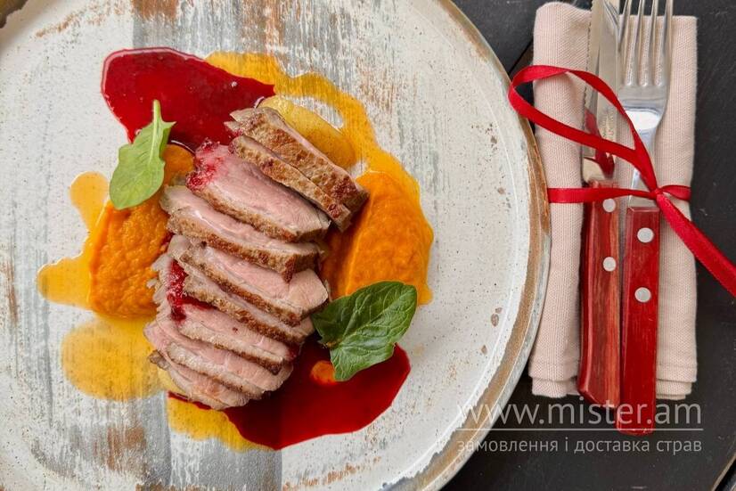 Філе качки з морквяним пюре та вишневим соусом