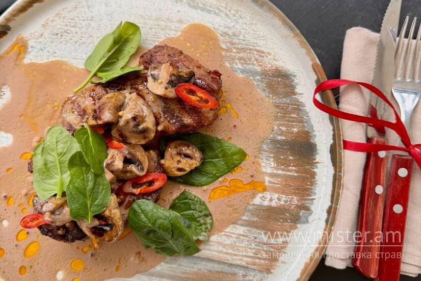 Соковий стейк ошийка обсмажений в спеціях з додаванням чебреця та часнику, в поєднанні з печерицями та стейк соусом.