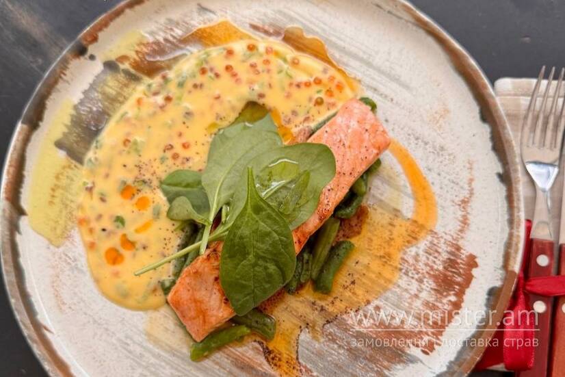 Ідеально приготований стейк лосося, його скоринка злегка золотиста й хрустка, а всередині риба залишається неймовірно ніжною та соковитою. Подається на подушці з бланшованої спаржі з додаванням молодого шпинату та підсмажених лисичок. Щедро политий теплим, легендарним соусом Голландез з додаванням часникового масла, спецій, льону та червоної ікри.