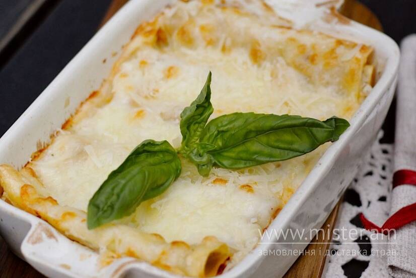 Неймовірно смачна італійська класика в поєднанні двох соусів м'ясного томатного болоньєзе та вишуканого білого соусу бешамель, з додаванням тертих сирів моцарели та пармезану.