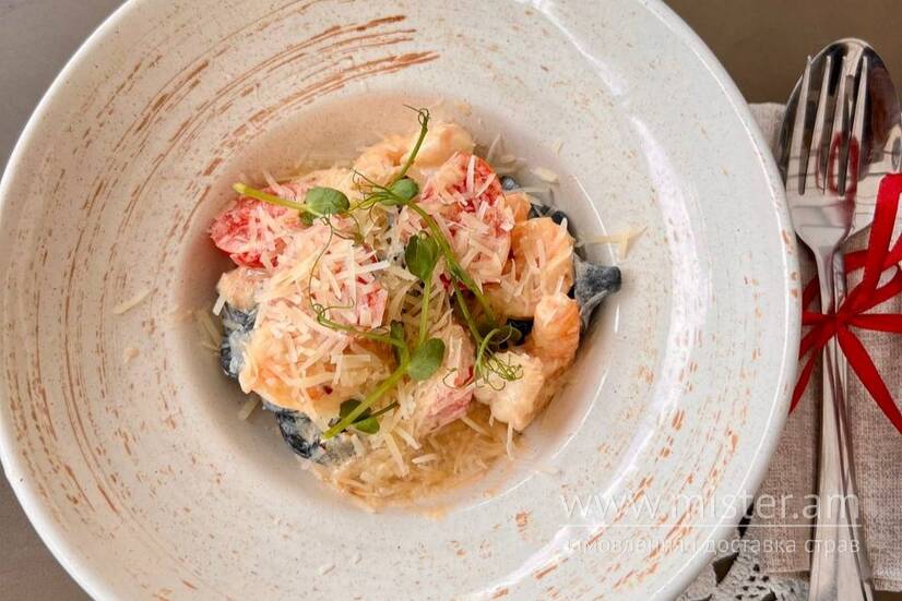 Тальятелле зі смаженими креветками та черрі (з чорнилами каракатиці)