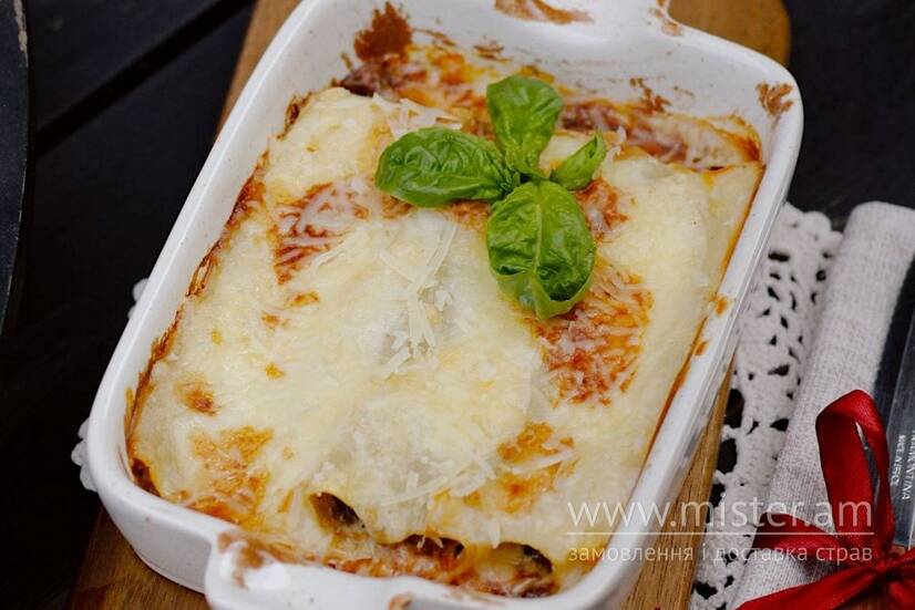 Запечені канелоні з рваною яловичиною та білими грибами у неймовірному вершковому соусі бешамель та демігласу, з додаванням ніжної тертої моцарели та пармезану, з нотками трюфельної пасти.