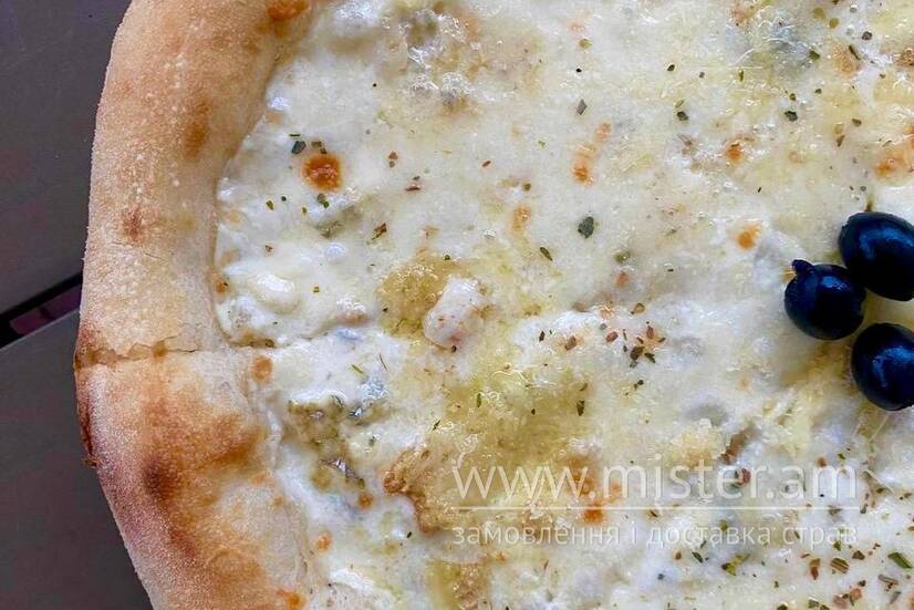 Соус вершковий, моцарела, горгонзола, брі, пармезан, маслини.