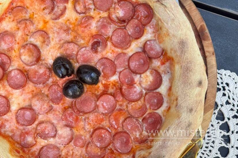 Соус пілаті, сир моцарела, сосиски молочні, маслини.