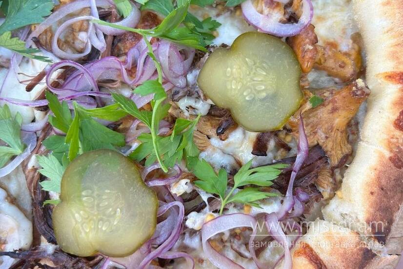 Соус вершковий, моцарела, томлена яловичина, лисички, цибуля червона, огірок маринований, гірчиця, маслини