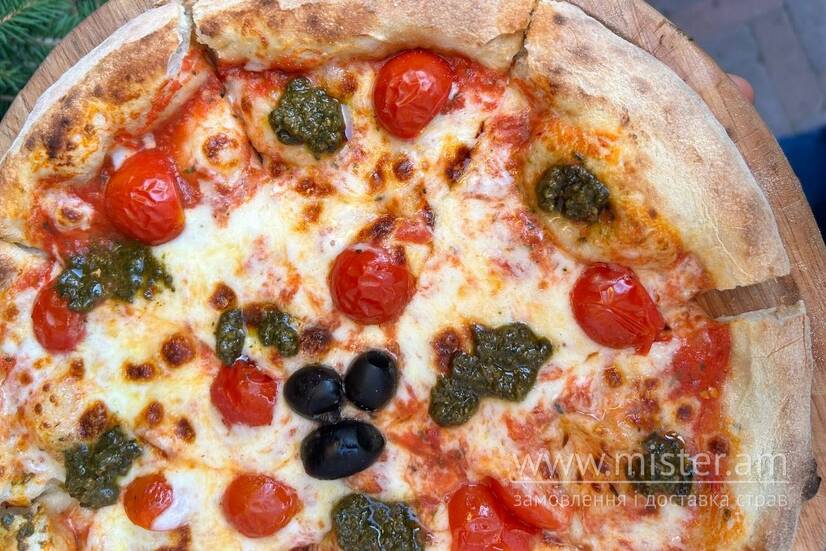 Соус пілаті, моцарела, маслини, томати чері, соус песто, базилік.