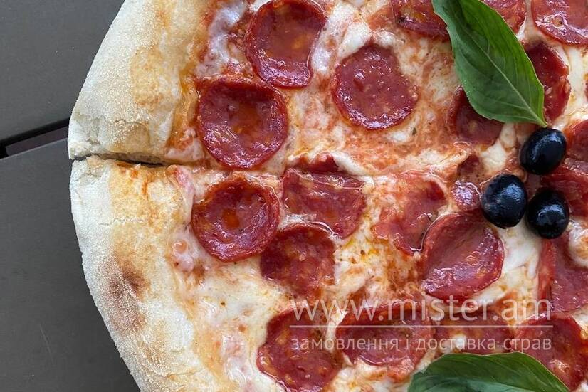 Соус пілаті, моцарела, пармезан, пепероні (салямі пікантне), маслини.