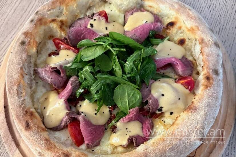 На вершковому соусі з ніжним ростбіфом, в поєднанні соусу Vitello Tonnato, сиром моцарела, помідорами чері та в'яленими томатами, міксом свіжого салату та нотками лимонного дресінгу.