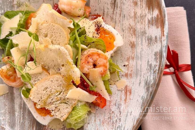 Тигрові креветки, злегка обсмажені до яскраво-рожевого кольору, додають салату витончену морську солодку нотку, яка чудово гармоніює з ніжними листям салату. Смак підкреслює класичний соус Цезар — кремовий, злегка пікантний, з нотками часнику, анчоусів, каперсів та оливкової оліі. В поєднанні стиглих томатів чері та курячого яйця. Завершує смак свіжо-натертий витриманий пармезан.