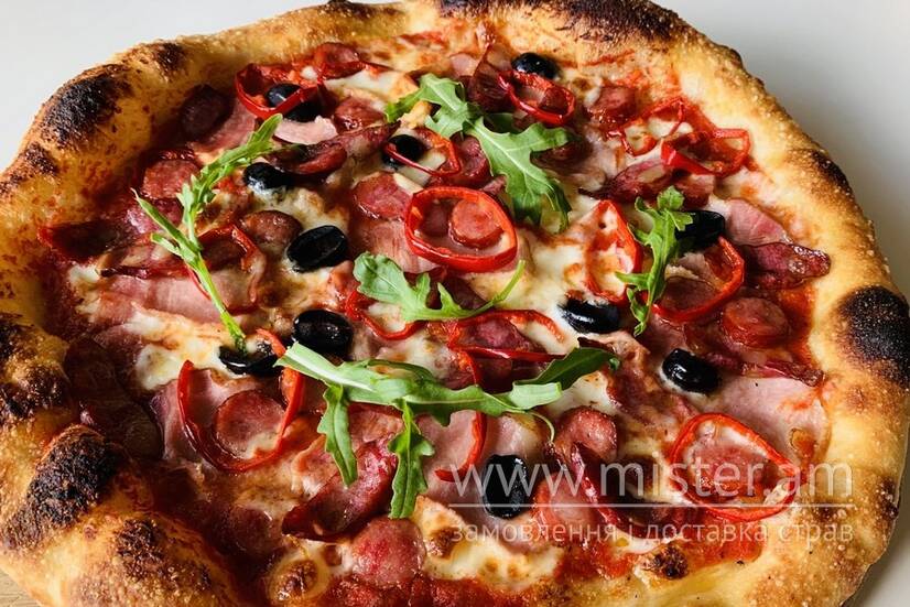 Фермерська моцарела, фірмовий соус пілаті, шинка, ковбаски кабаноси, ковбаски мисливські, помідор черрі, перець болгарський, маслини.