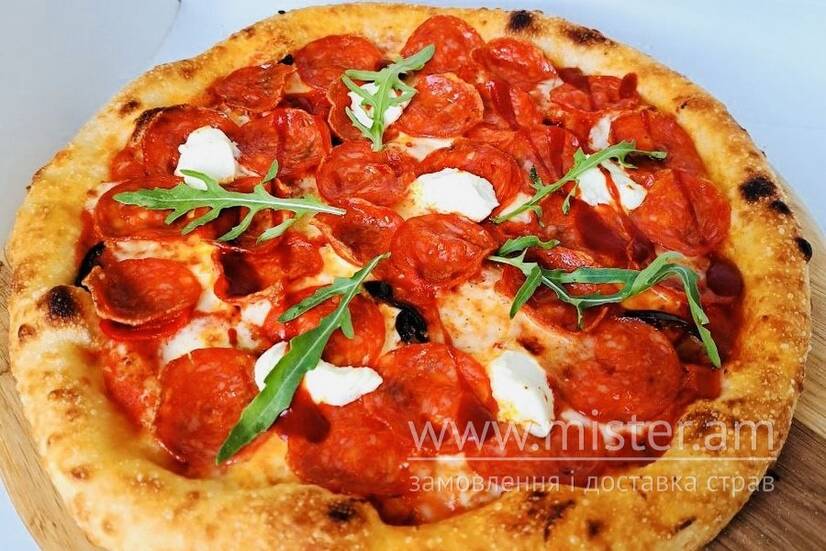 Фермерська моцарела, фірмовий соус пілаті, ковбаса "Чорізо", перець халопеньо, перець чилі, рікота, гострий соус.