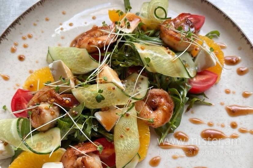 Мальва Салат з креветками, горіховою заправкою та апельсином