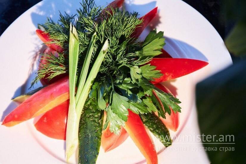 Огірок свіжий, томат свіжий, перець болгарський, салат, рукола.