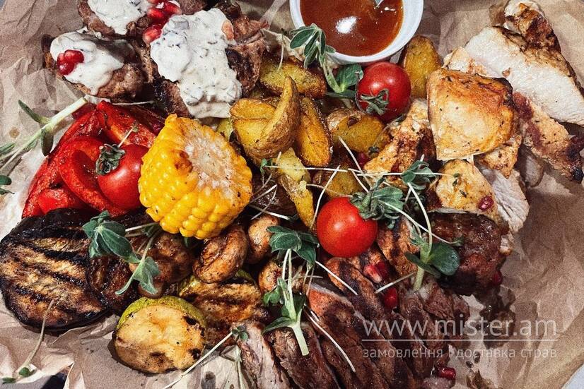 Стейк зі свинного ошийку, курячий стейк, медальйони зі свинини, картопля по-селянськи, овочі гриль, соус BBQ.