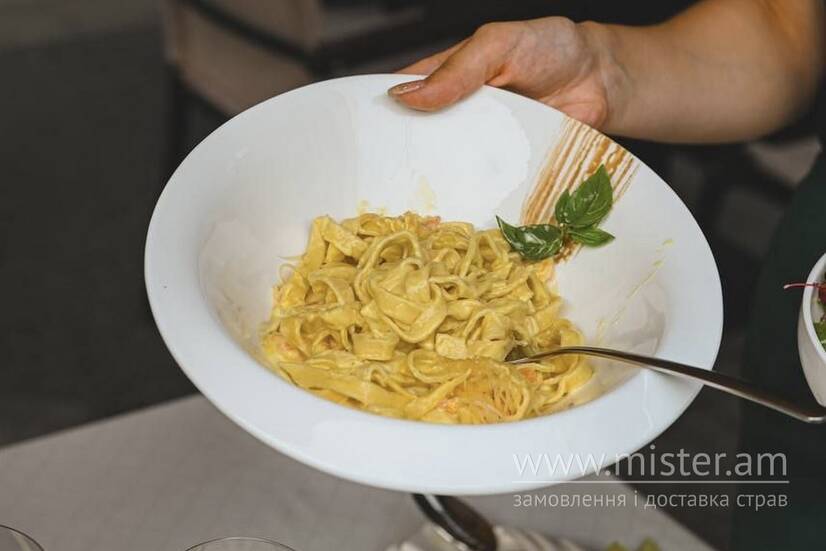 Паста, сирний соус, креветка коктейльна, чеддер шматочками, брі, пармезан.