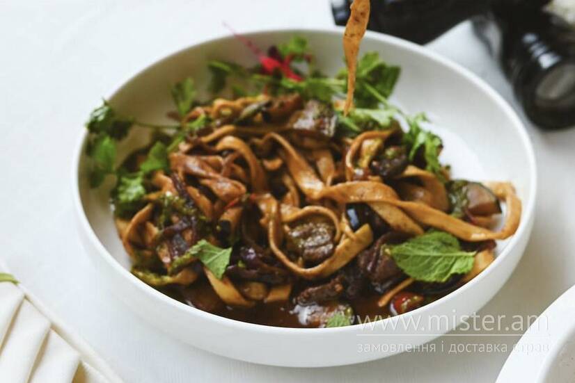 Паста, баранина, баклажан, печериці, соєвий соус, чімічурі, зелень.