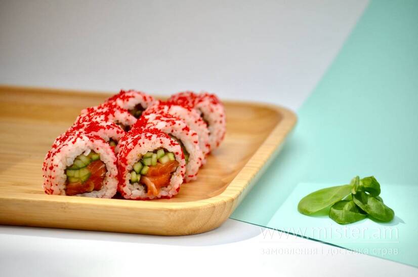 Норі, рис, лосось, огірок, ікра масаго, майонез.