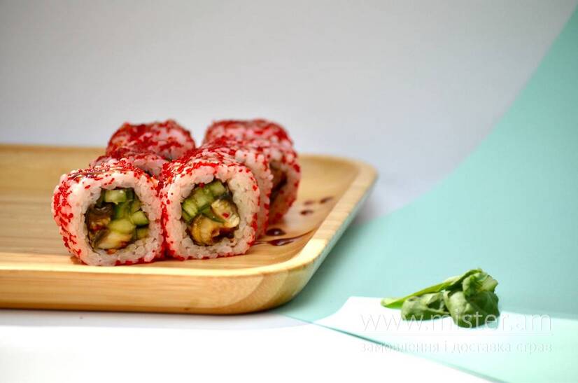 Норі, рис, вугор, огірок, ікра масаго, майонез.