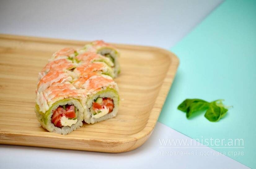 Норі, рис, креветка, лосось, авокадо, огірок, крем-сир, ікра масаго.