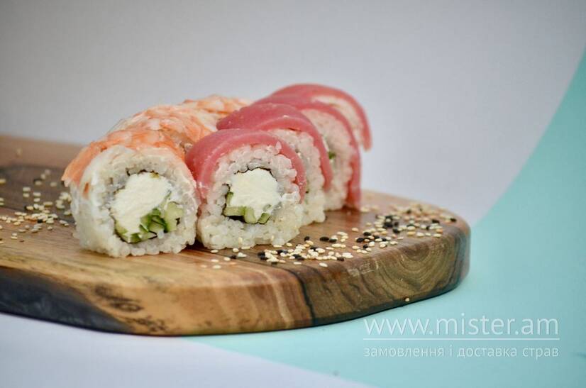 Норі, рис, креветка, тунець, крем-сир, огірок.