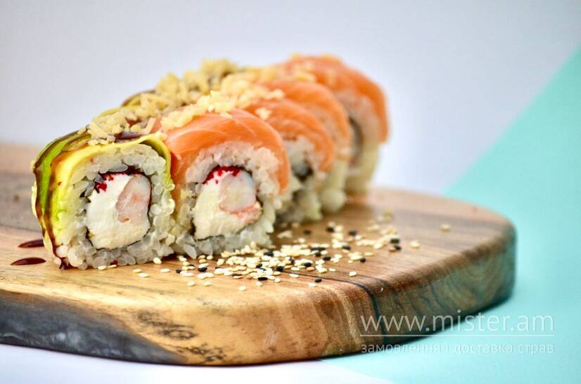 Норі, рис, креветка, лосось, авокадо, крем-сир, ікра масаго, соус унагі, пармезан.