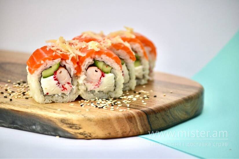 Норі, рис, лосось, креветка, крем-сир, огірок, ікра масаго, пармезан.