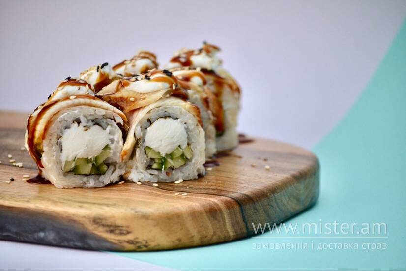 Норі, рис, вугор, крем-сир, огірок, соус унагі, кунжут.