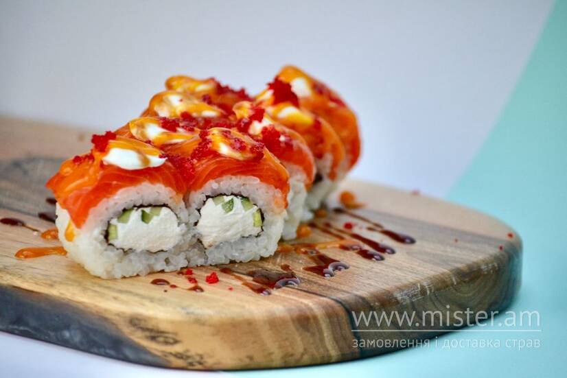 Норі, рис, лосось, крем-сир, огірок, ікра масаго, соус манго, соус унагі.