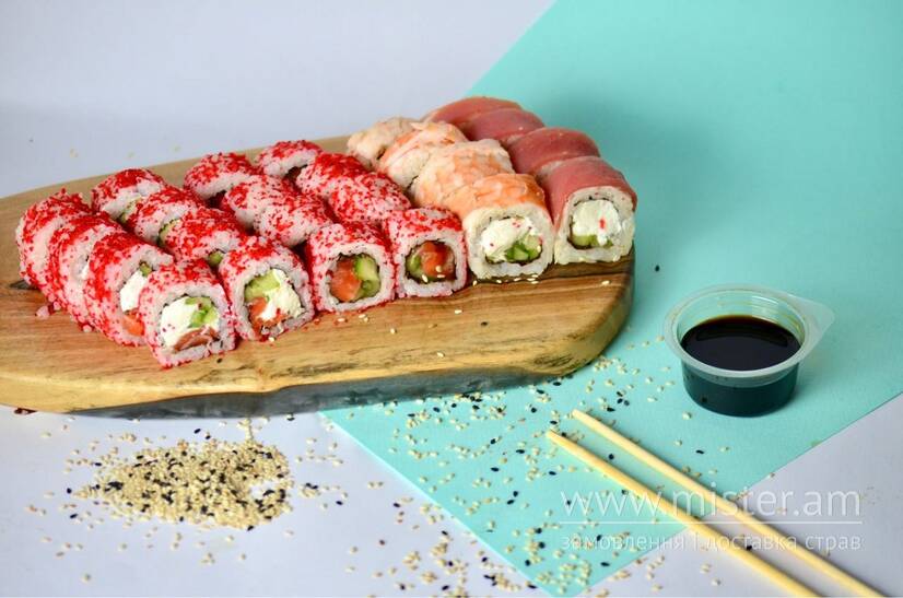 Каліфорнія з лососем, Філадельфія дует з креветкою та тунцем, Філадельфія в ікрі масаго.