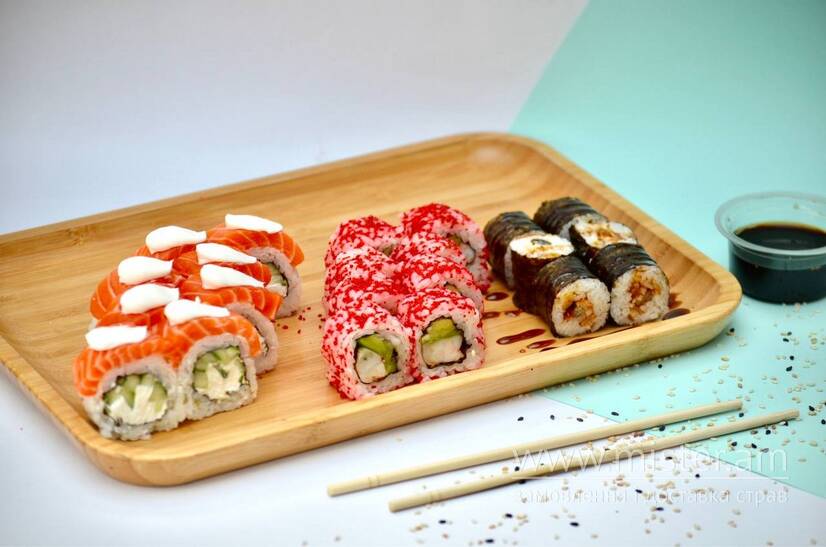 Філадельфія з лососем де-люкс, Каліфорнія з креветкою, макі з вугрем.