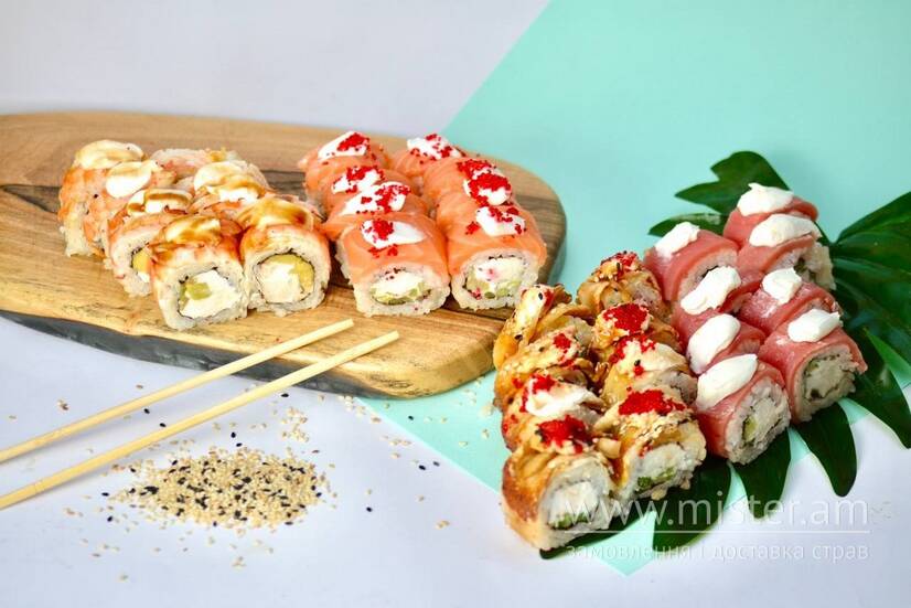 Філадельфія з лососем де-люкс, Філадельфія з креветкою, Філадельфія з тунцем, Філадельфія з вугрем.