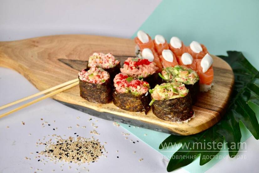 Філадельфія з лососем де-люкс, Гункани з лососем, Гункани з тунцем, Гункан з креветкою.