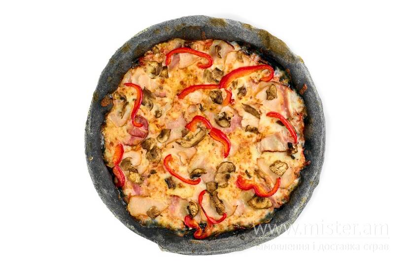 Чорне тісто, соус барбекю, моцарела, бекон, копчена курка, цибуля маринована, солодкий перець, печериці.