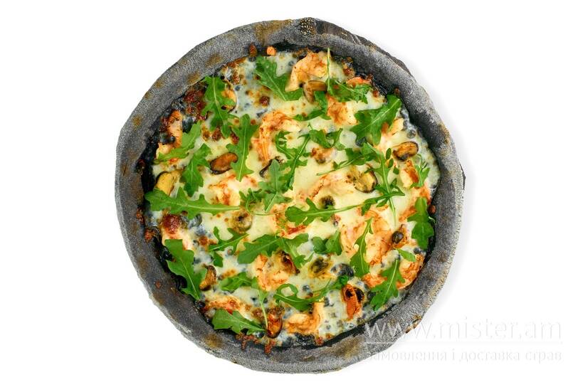 Чорне тісто, соус вершковий, моцарела, тигрова креветка, мідії, рукола.