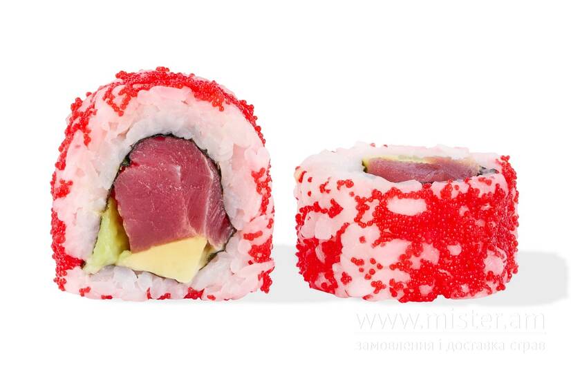 Рис, норі, авокадо, ікра тобіко, тунець, японський майонез, кунжут білий.