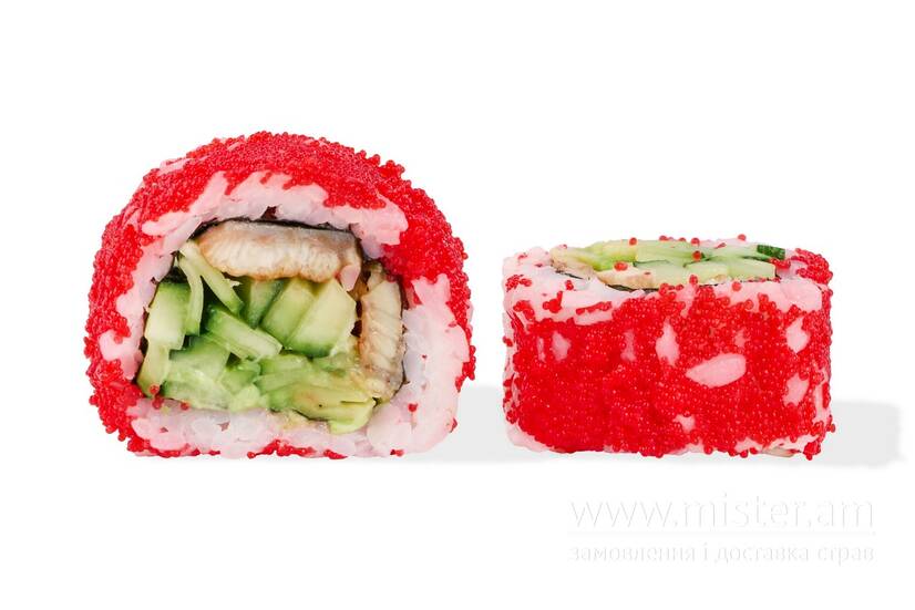 Рис, норі, авокадо, вугор, ікра тобіко, огірок, японський майонез.
