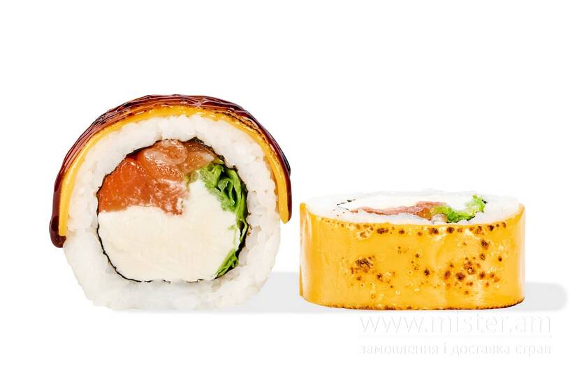 Рис, норі, крем сир, лист салату, чедер, соус унагі, лосось, авокадо.