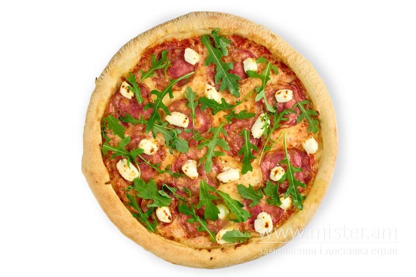 Томатний соус, моцарела, салямі, сир філадельфія, рукола.