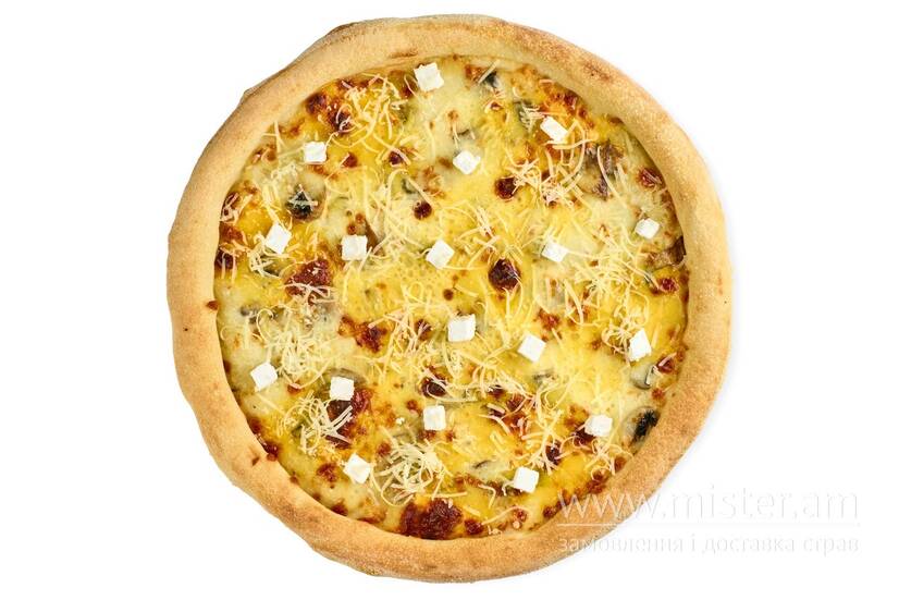 Вершковий соус, моцарела, чедер, печериці, фета, пармезан.