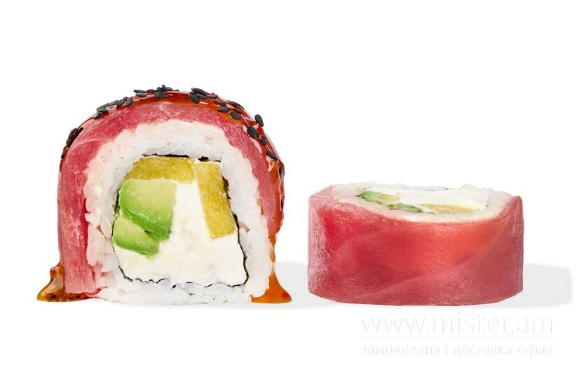 Рис, норі, крем сир, груша, манго, авокадо, тунець, кунжут чорний, соус солодкий чилі.