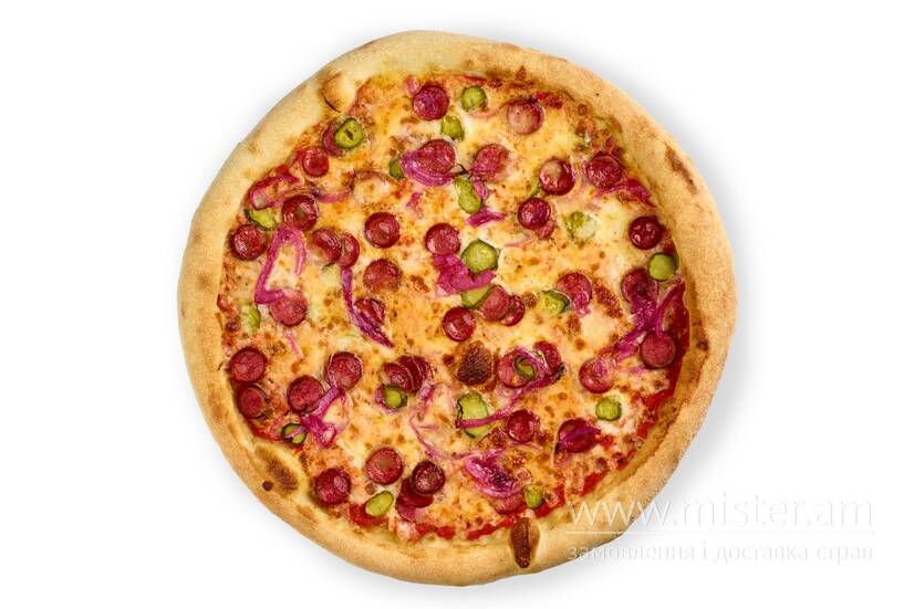 Томатний соус, моцарела, мисливські ковбаски, огірок корнішон, цибуля маринована.