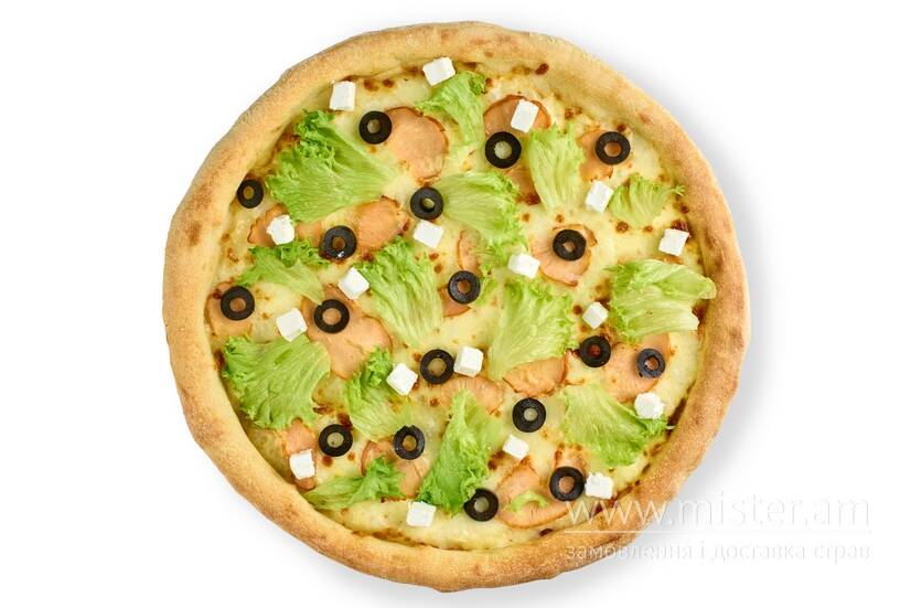 Вершковий соус, моцарела, курка копчена, лист салату, сир фета, маслини.