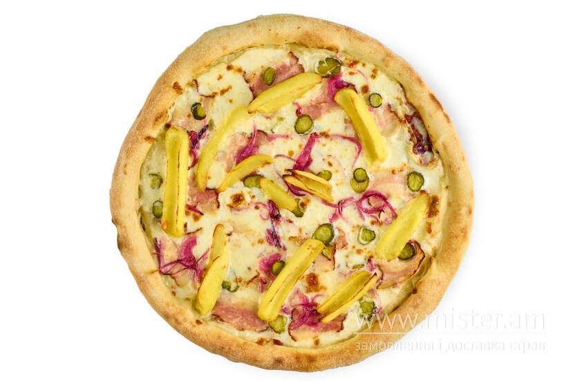 Вершковий соус, моцарела, бекон, огірок корнішон, картопляні діпи, цибуля маринована.