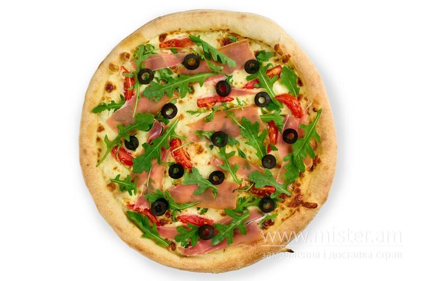 Вершковий соус, моцарела, хамон, рукола, маслини.