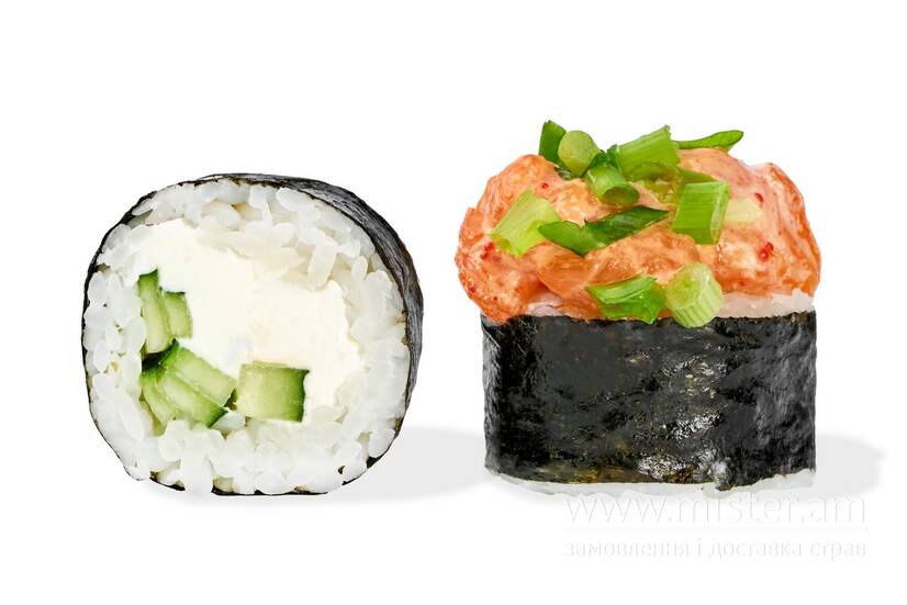 Рис, норі, крем сир, огірок, лосось, соус спайс, зелена цибуля.