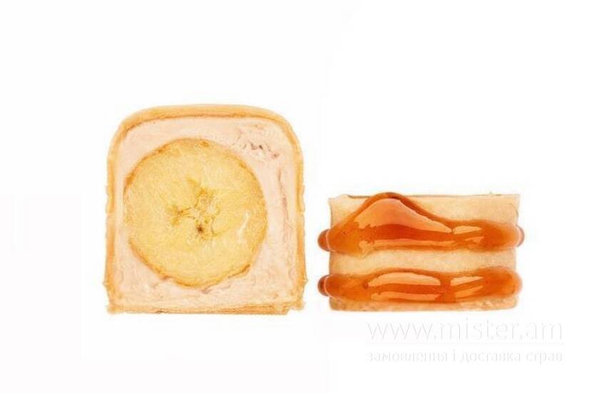 Папір соєвий, крем сир, топінг карамельний, мигдалеві пластівці, банан.