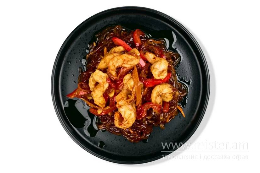 Локшина рисова, цибуля свіжа, морква, перець болгарський, креветка тигрова, часник, соус устричний, кунжут білий.