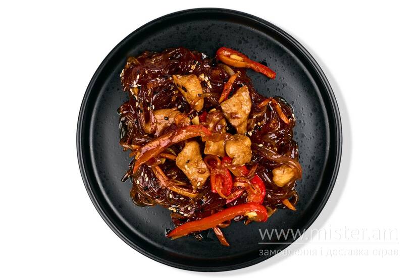 Локшина удон, цибуля свіжа, морква, спаржа, філе куряче, соус устричний, соус теріякі, кунжут білий.